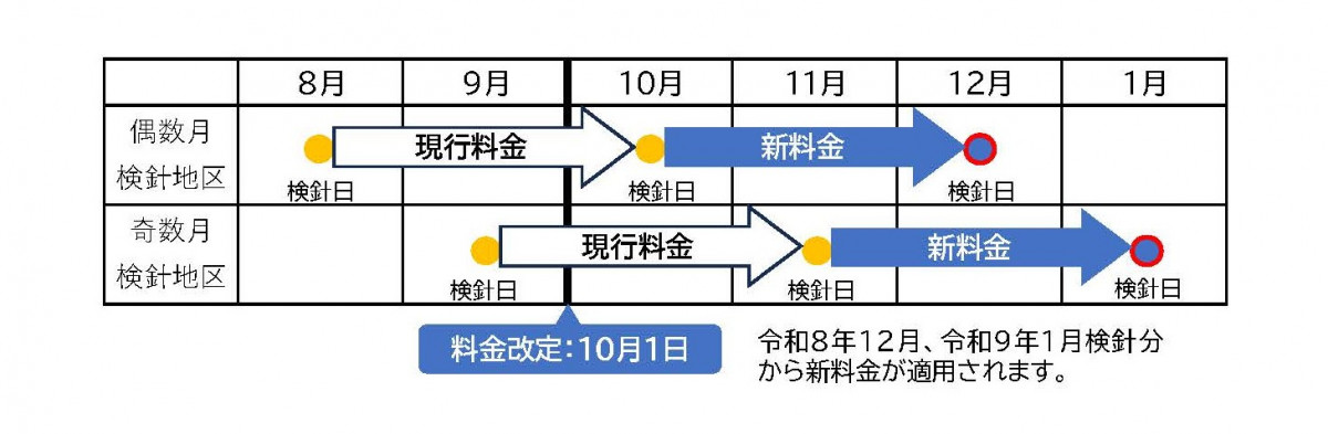 10月以降にはじめて検針された日以降の使用分(12月・1月検針分)から新料金が適用されます。